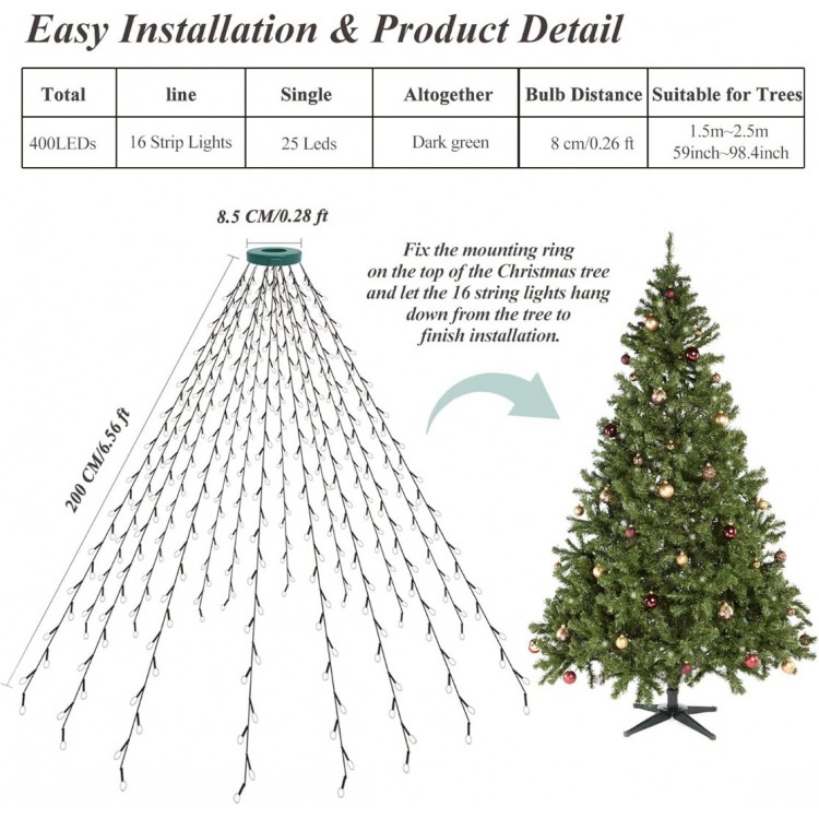 • 【Reasonable Design, Easy to Install】The Christmas decor light has 16 light strings, each line is 6.6ft (2m) long and equipped with 25 LEDs, a total of 400 LEDs. There is a mounting ring on the top of the Christmas lights, just fix the ring on the top of the Christmas tree and let the 16 string lights hang down from the tree to finish installation. The 16.4ft(5m) power cord allows you to place the tree lights anywhere, let the lights illuminate whole room to enjoy a wonderful fairy light show!