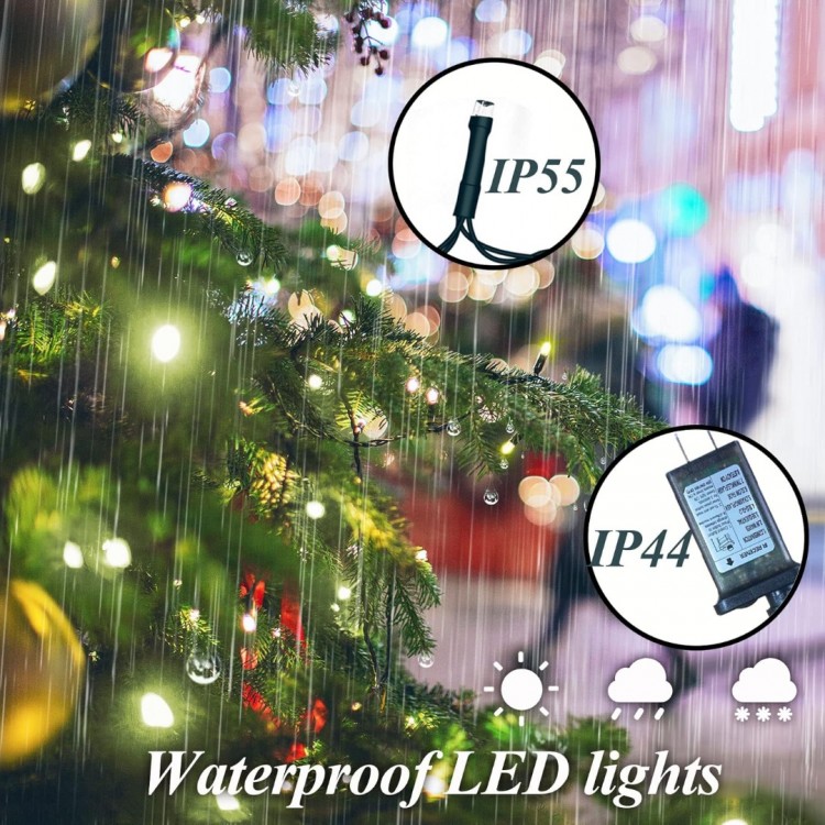 • 【Waterproof LED lights】The Christmas LED string lights are made of waterproof material(IP55 waterproof LED light strings & IP44 waterproof adapter), which can withstand light rain and water splashes, also work well in snowy weather. Perfect for outdoor and indoor Christmas decorations, party, holiday, wedding and garden, yard, patio decorations.
